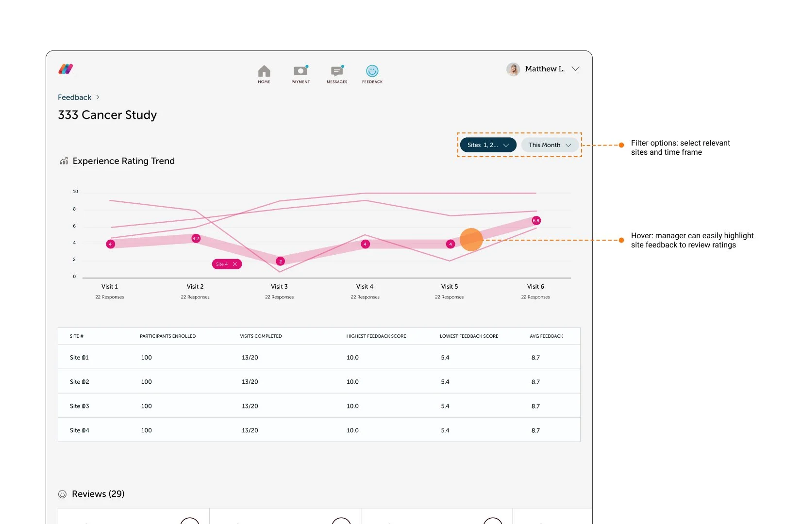 Part of the success of clinical trials depend of the managers being able to take action based on user feedback. That’s why we designed a dynamic data display on the management side, combining filter features and glanceable hover states.